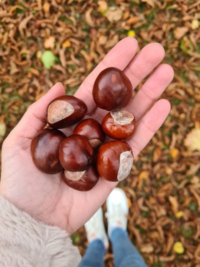 Noch einmal sammelten wir Kastanien. Ich weiß nicht wie viele Kilogramm wir schon zu Hause haben. Auf jeden Fall genügend für ein Mini-Bällebad als Reflexzonen-Massage zum durchlaufen.